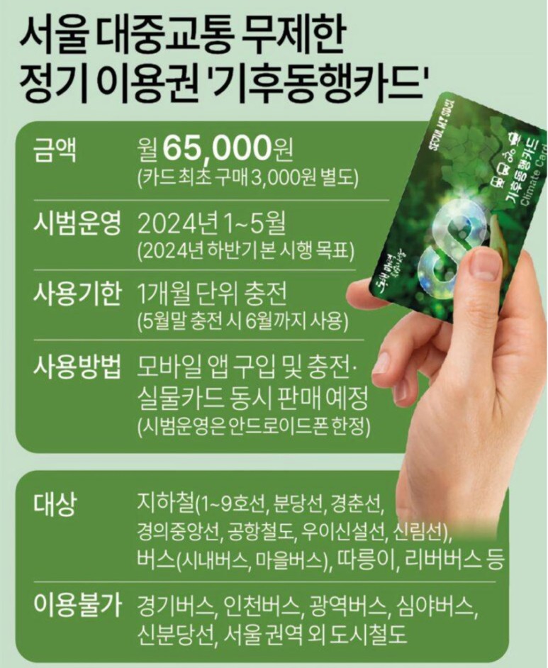 이 기후동행카드는월 6만원대에 대중교통과 서울 공공자전거 따릉이를 횟수 제한 없이 이용할 수 있는 무제한 대중교통