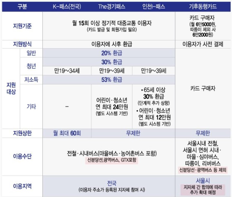 올 상반기에 K-패스, 기후동행카드, 더 경기패스, 인천-I패스 등 정부와 수도권 3개 지자체가 진행하는 교통지원 사업도 있다고 합니다. 본인의 대중교통 패턴을 고려하여 기후동행카드, 더 경기패스, 인천 I-패스를 이용하던가 정부 사업인 K-패스를 선택하면 좋을 것같습니다. 특히 K 패스는 이동거리와 상관없이 이용금액으로만 계산되며 시내버스 뿐 아니라 광역버스(빨간버스), 지하철뿐 아니라 수도권 GTX-A선 등 K패스 적용 범위가 넓어졌어요~