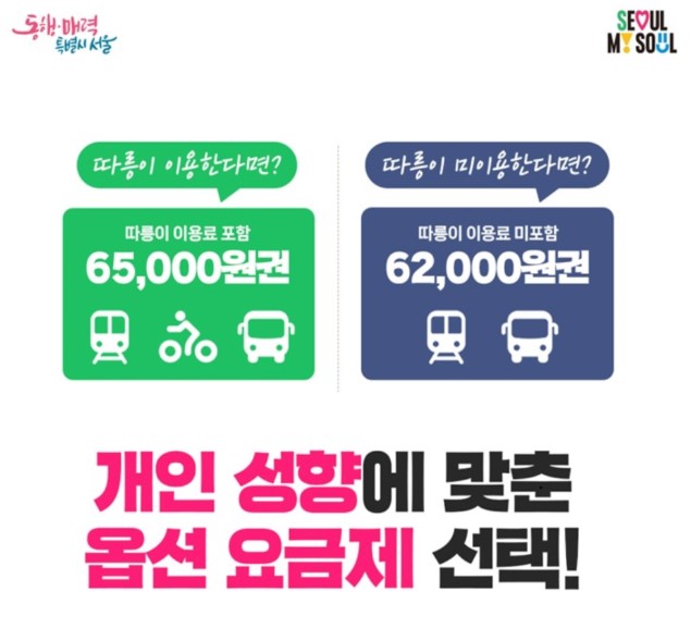 그 두가지 금액의 차이는 따릉이 이용 여부에 따라 6만2천원권과 6만5천원권 2종으로 나뉘게 됩니다.