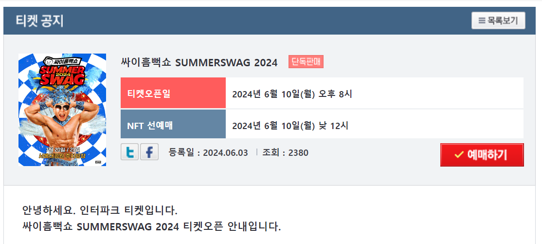 싸이흠뻑쇼 SUMMERSWAG 2024 티켓오픈 안내입니다