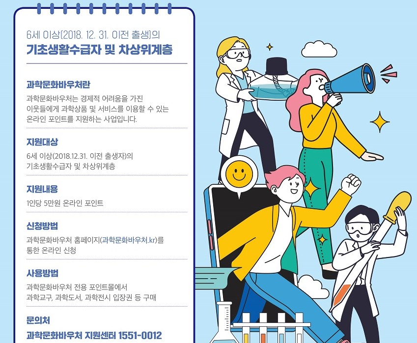 과학문화방처는 기초생활수급자와 차상위계층의 이웃들에게 과학상품 및 서비스를 이용할 수 있는 온라인 포인트를 지원하는 사업입니다. 저도 아이 유치원때 과학수업을 1년정도 받게 한 적이 있었는데 집에서 하지 못하는 흥미로운 실험이나 재미난 원리들을 배우고 왔던 기억이 있습니다.