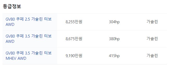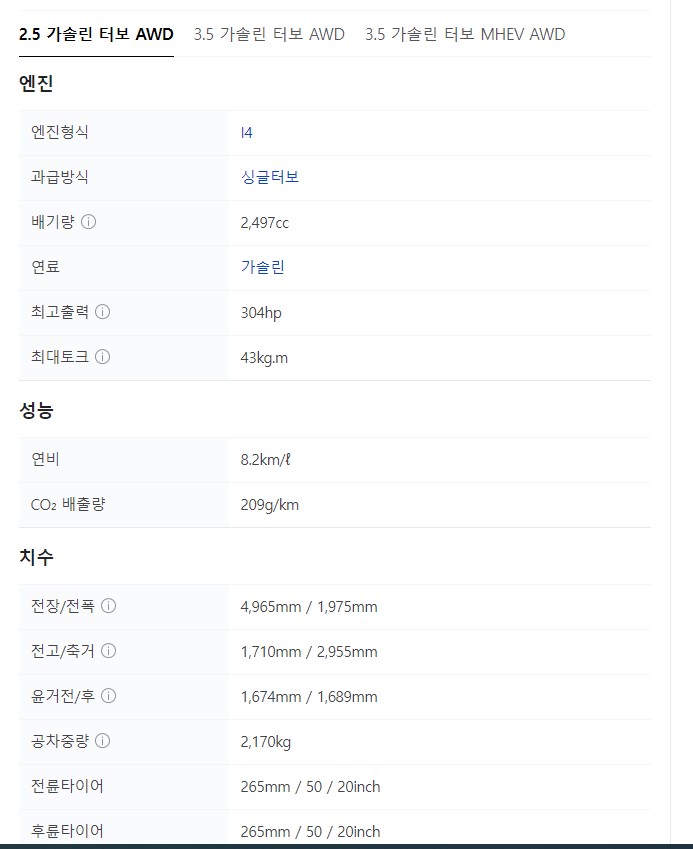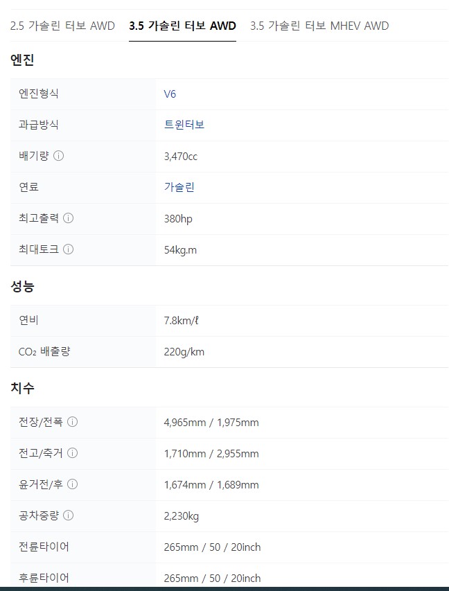 일반 모델은 엔진 타입이 2.5와 3.5이지만 쿠페는 '3.5 터보 48V 일렉트리 슈퍼차'입니다.